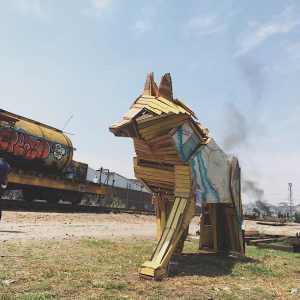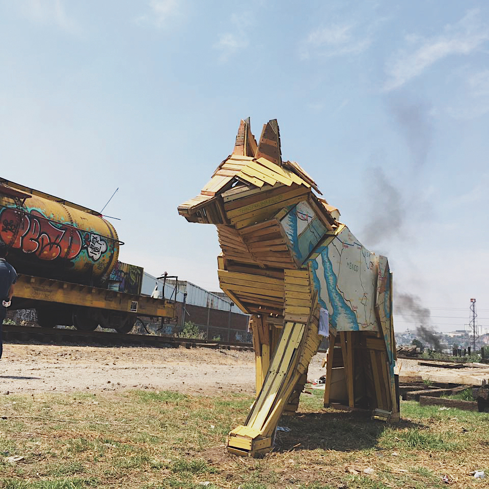 <p>En agosto de 2017, Gutiérrez creó “El Transportapueblos”, una escultura en forma de coyote hecha de madera, pensada para los migrantes.</p>