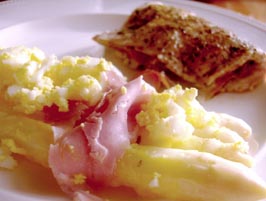 About two weeks ago I saw them already at the greengrocer: white asparagus! Sadly the price for 1 pound was so high that I didn’t buy them at that time. People also call them “the white gold” but that has nothing to do with the price! Every time I’m at the greengrocer I keep an eye on the price tag, but not much has changed yet. I can hardly wait, because these white ones are much more delicious than the green ones. The green ones, you can buy all year round, the white asparagus only a few weeks in a year. Of course, I’m talking about fresh ones, from The Netherlands or Germany (just a few miles from here).