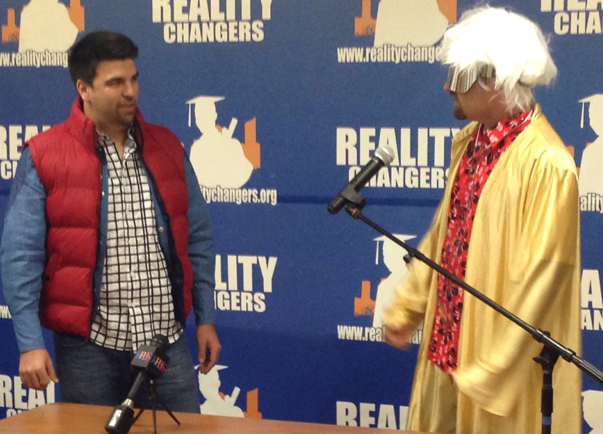 <p>Durante la conferencia de prensa, que en realidad era un sketch en honor al 30 aniversario de la película clásica, Back to the Future, Reality Changers lanzó su nueva iniciativa Give to the Future, que crea un modelo en el que no sólo los donantes contribuyen, sino también los destinatarios, tales como los distritos escolares.</p>