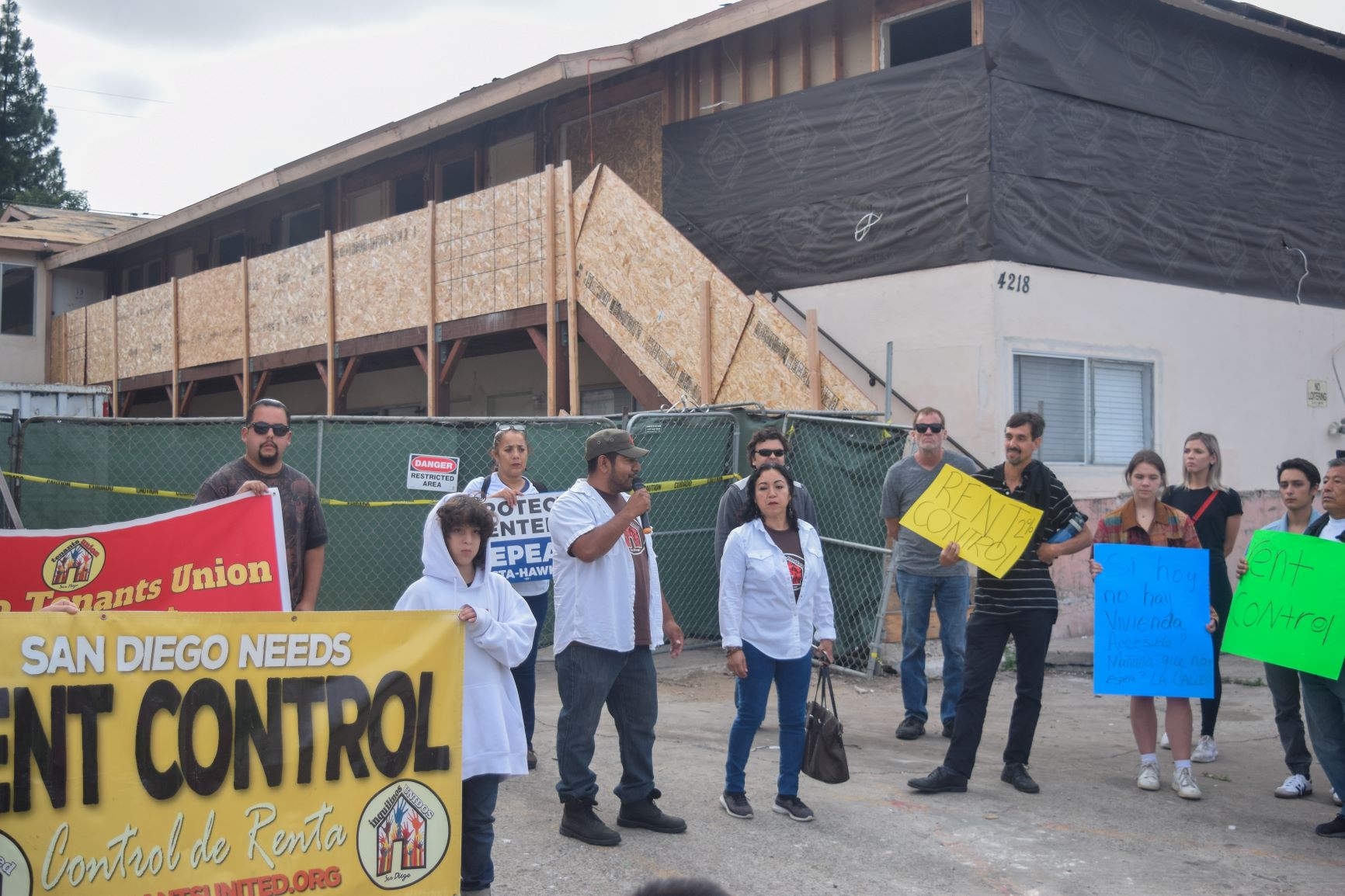 <p>At the site of an uninhabitable apartment building in City Heights, where new management has increased rent by upward of $700 in recent months, local residents and tenants rights activists gathered last Friday to bring attention to the issue of quickly rising rent prices in underserved communities and to call on City Council to take action on a rent control ordinance to cap yearly increases to 2%. </p>