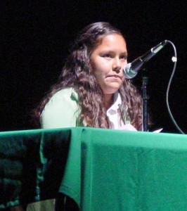 Evelyn Larisa Mejía Quevedo, leyendo un poema de su autoría.
