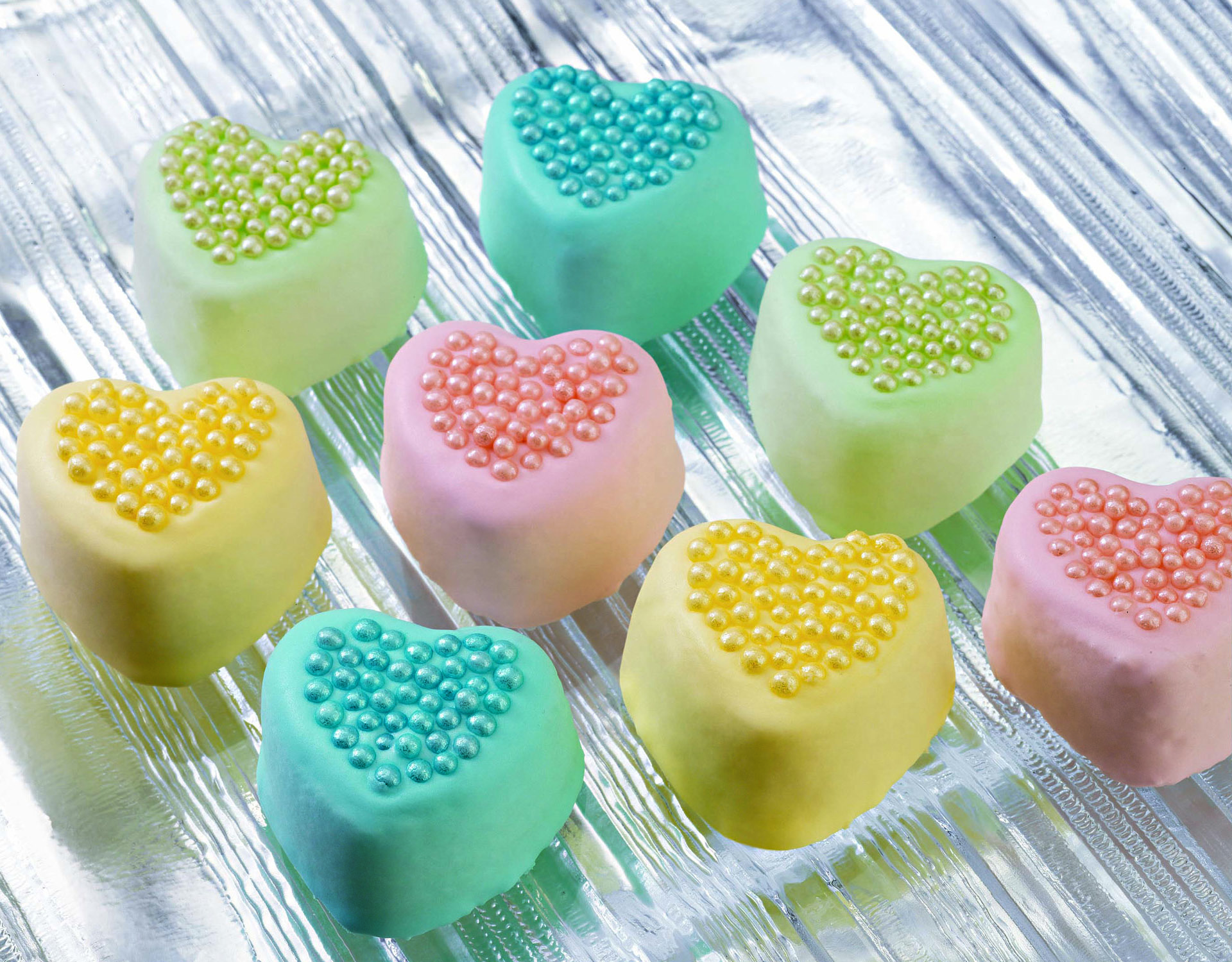 Vestidos de un glaseado en tonos pastel y decorados con perlas de azúcar, estas pequeñas gemas son facilísimas de hacer. Para su conveniencia, utilice una caja de mezcla para pasteles (cake mix), y hornee en un molde de silicona en forma de pequeños corazones. Los pastelitos salen del molde muy fácilmente una vez que se enfrían (y la silicona es súper fácil de limpiar).