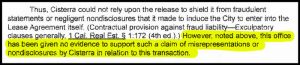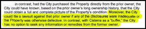 <p>The memo also states that the deal terms releasing Cisterra and the sellers from any liability prevents the City from suing for defects or deficiencies in the building unless the City could prove Cisterra committed “fraud or misrepresentation”, but the memo also states that no evidence has been presented that Cisterra “failed to provide any known information to the City regarding the Property or its condition.”</p>