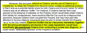<p>“Moreover, this exclusive reliance on Cisterra, and the use of Cisterra as a ‘middleman’ to obtain the Property from the prior owner, creates an additional problem, in that it acts as a potential liability shield for both Cisterra and the prior owner, for which Cisterra acts as an effective ‘buffer’,” the memo states. “Indeed, <strong>Cisterra’s limited role as a temporary transferee, together with the strong exculpatory provisions in the Lease Agreement, would have specifically <span style="text-decoration: underline;">dis-incentivized</span> Cisterra from conducting a proper due diligence</strong>, so it could remain ‘deliberately ignorant’ of the Property’s condition,” the report reads on Page 21. The use of bold and underlined text above appears in the actual text of the legal memo.</p>