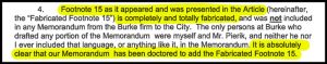 <p>On the same day the NBC7 story first ran, Brian A. Pierik, one of the two Burke lawyers who signed the memo, issued a letter to then-Mayor Kevin Faulconer claiming the footnote in the NBC7 story was “completely fabricated”, but admitted that “our Memorandum has been doctored to add Fabricated Footnote 15” without disputing the rest of the memo.</p>