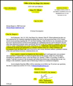<p>Hargrove received a “Criminal Investigation” letter from Deputy City Attorney John Hemmerling, stating that he had “initiated a criminal investigation” because the “unauthorized release of confidential documents and information is a criminal violation of the City’s Ethics Ordinance, the Government Code, the Penal Code, and if received or sent via electronic method, a violation of state and federal electronic communications acts.”</p>