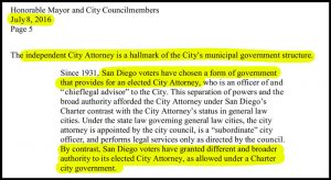 <p>And a Memorandum of Law dated July 8, 2016, while Elliott was running for City Attorney, point out that San Diego’s “independent City Attorney is a hallmark of the City’s municipal government structure” and specifically mentions that the position is not subordinate to the City Council.</p>