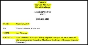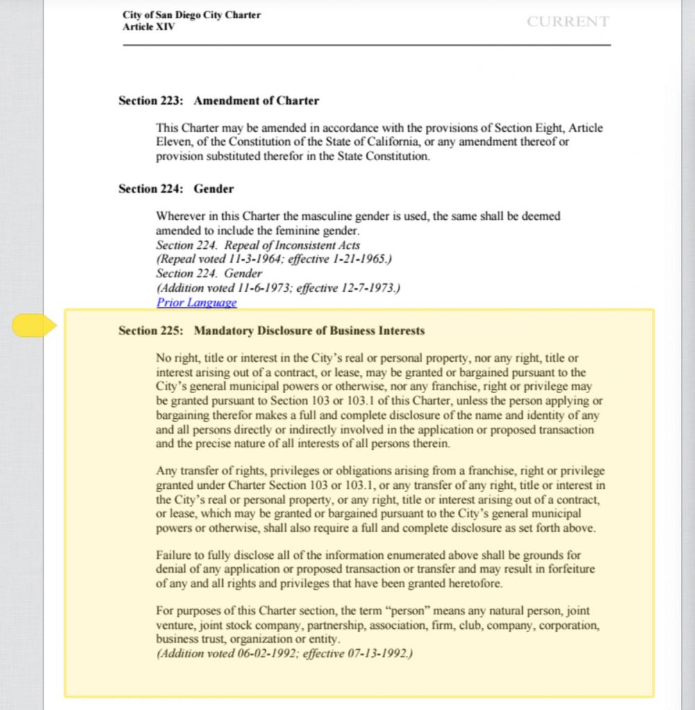 <p><span style="font-weight: 400;">But, when City Attorney Mara Elliott was asked on August 6, 2020, by then-Councilwoman Barbara Bry whether full disclosures were made as required by Section 225, Elliott responded in writing by quoting the language of Section 225 as it was amended in November 2018 to only require disclosure of “<em>the names and identities of all natural persons who will receive more than 10% of the contracted amount or who own more than 10% of the entity.</em>”</span></p>