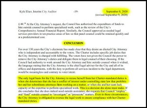 <p>Elliott’s September 8, 2020, legal opinion was in response to the Auditor’s office asking to hire outside counsel. Elliott’s conclusion that only the City Attorney can provide and oversee outside lawyers would be a conflict of interest if the Auditor were to investigate actions by the City Attorney’s office.</p>