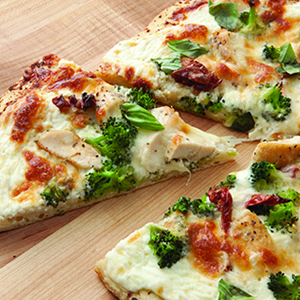- To assemble pizza, dot crust with broccoli and chicken. Dot crust with spoonfuls of ricotta, spreading gently with the back of spoon. Add sliced sun-dried tomatoes, scattering around pizza to edges. Complete assembly with a thin layer of shredded mozzarella.