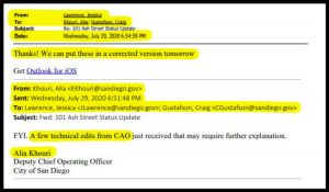 <p>But just 33 minutes later, Khouri emailed Jessica Lawrence, then-Director of Policy and Council Affairs for Mayor Faulconer, along with Craig Gustafson, that “<em>a few technical edits from the [City Attorney’s Office] just received that may require further explanation.</em>” Lawrence responded three minutes later that “<em>We can put these in a corrected version tomorrow.</em>”</p>