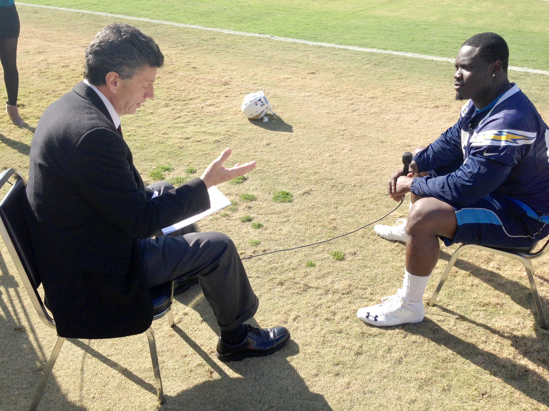 <p>Después de una práctica reciente previa al partido contra Denver en Chargers Park, cerca del Qualcomm Stadium, Villanueva estuvo entrevistando a varios jugadores para su programa de radio y televisión.</p>
