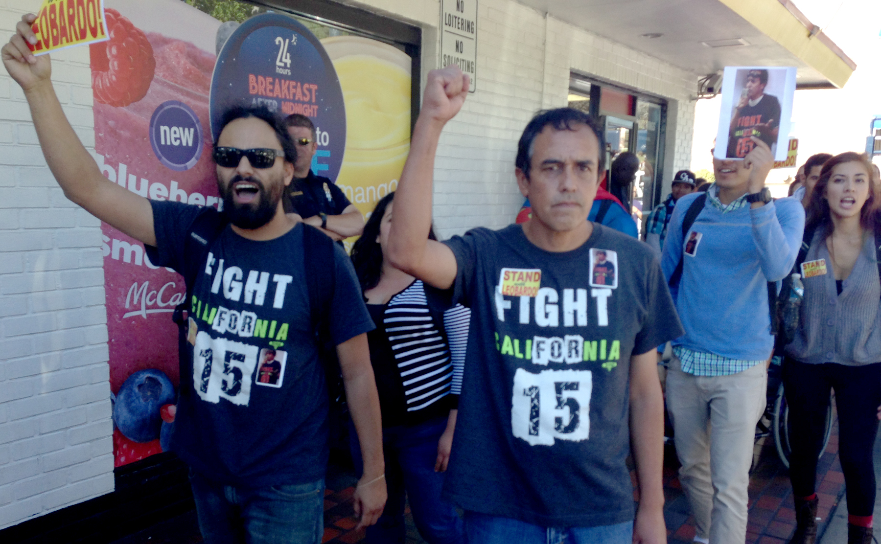 <p>On Thursday, October 31st, a coalition of community activists, workers’ unions, and college students, protested in front of McDonald’s located on Park Ave., across from San Diego City College. More than 200 people walked from City College to the restaurant demanding Meza be given his janitorial job back.</p>