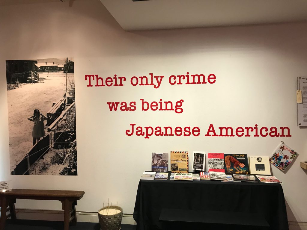 <p>The words in even bigger font, this time in red, can be seen plastered above the books for one final, lasting note: “Their only crime was being Japanese American.”</p>