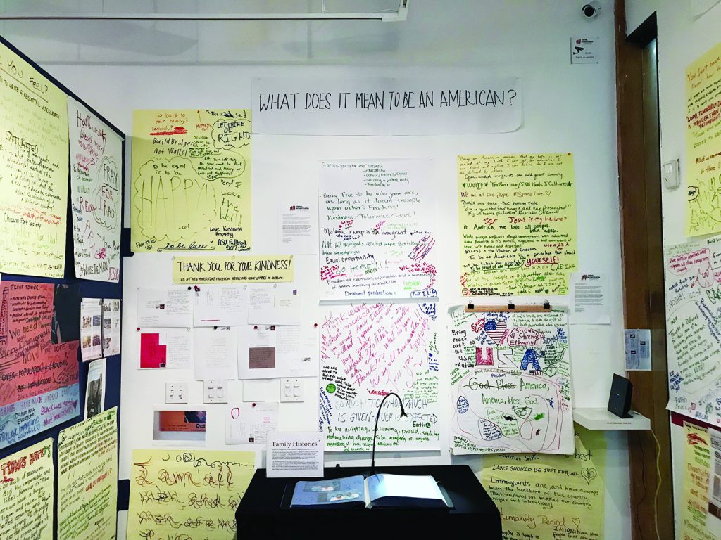 <p>On the wall opposite to that, a similar handwritten sign poses the question: “What Does It Mean To Be An American?” A few words stand out in deliberate red ink: “We are all immigrants.”</p>
