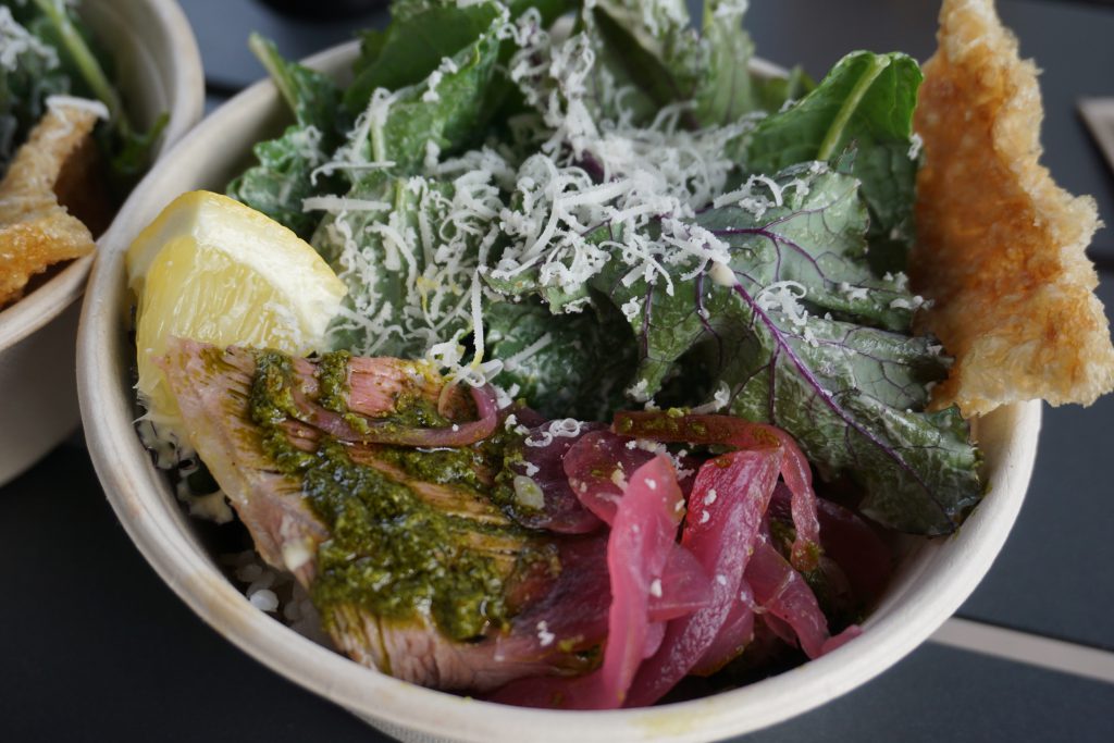 <p>The Roast Meat &amp; Sandwich Shop, which also has a location in Liberty Station, prepared a beef and rotisserie chicken bowl with a side of kale caesar salad. One bowl was filled with lemon rice, delicious rotisserie chicken, and a piece of chicharon – fried pork belly.</p>