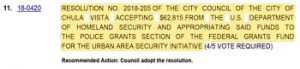 <p>In September 2018, the City of Chula Vista applied for and received a grant from UASI funds that were listed on the City Council agenda as “<em><span style="text-decoration: underline;">accepting $62,815 from the U.S. Department of Homeland Security and appropriating said funds to the police grants section of the federal grants fund for the Urban Area Security Initiative</span></em><i>,</i>” without reference to the items to be purchased.</p>