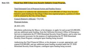 <p>Recently, the December 8<sup>th</sup> San Diego City Council agenda listed an item on its consent calendar, “<span style="text-decoration: underline;"><em>to authorize the administration of $16,900,000 of Urban Area Security Initiative grant funding for San Diego Urban Area regional projects, a portion of which will be retained by the City of San Diego</em></span>,” without any backup information listing the proposed uses for the funds. This item was the approval of the annual UASI grants from the US DHS.</p>