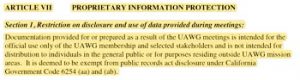 <p>Seemingly against the CPRA, the UAWG Charter’s states: <span style="text-decoration: underline;"><em>“Documentation provided for or prepared as a result of the UAWG meetings is intended for the official use only of the UAWG membership and selected stakeholders and is not intended for distribution to individuals in the general public or for purposes residing outside UAWG mission areas. It is deemed to be exempt from public records act disclosure under California Government Code 6254(aa) and (ab).”</em></span></p>