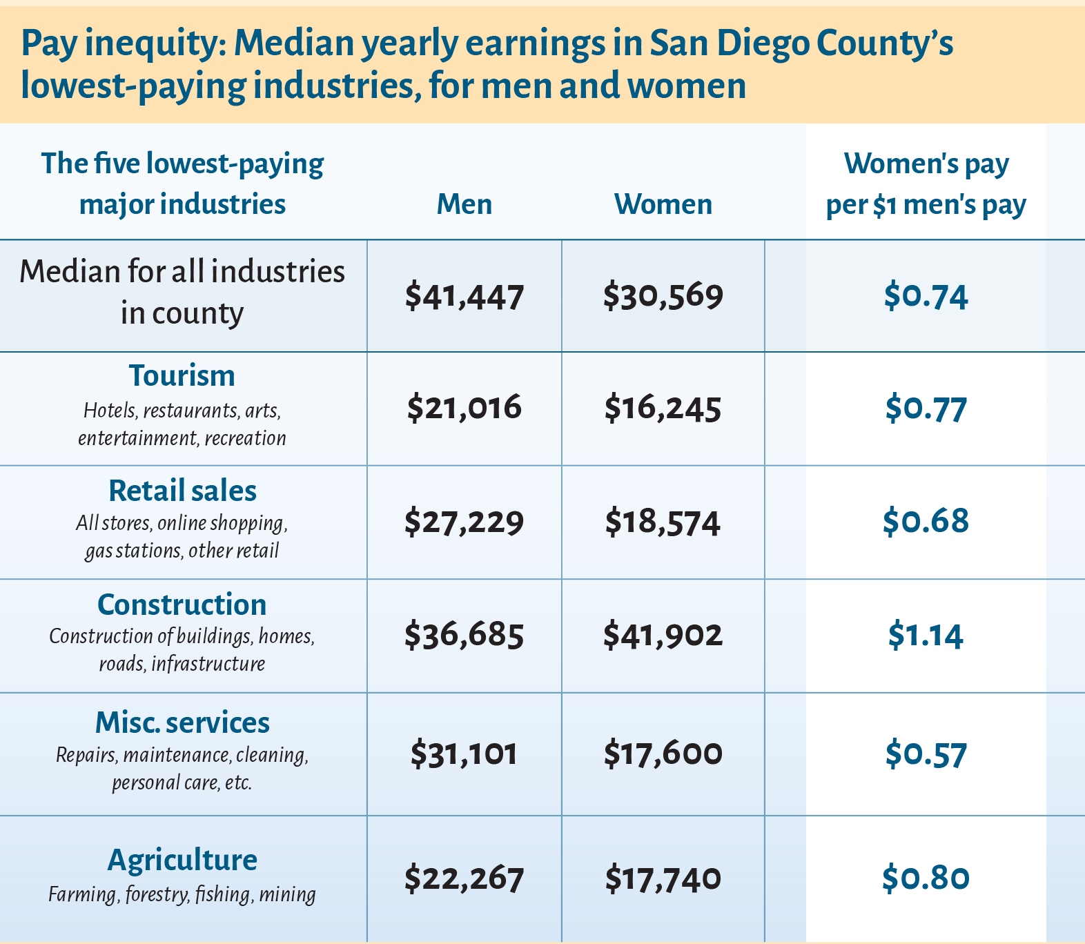 El estudio denominado “Viviendo Sueldo a Sueldo” realizado en el Condado de San Diego, muestra que el salario promedio de cada mujer latina es de 41 centavos por cada dólar que percibe un hombre de origen anglosajón, esta distinción, aseguran, merma en una comunidad que ocupa la tercera parte de la población en San Diego.<br>