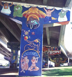<p>There were many other women. In 1975, Sacramento artists collective, the Royal Chicano Air Force (RCAF), had a contingent of women who painted in the park; they came to San Diego from Sacramento and left behind beautiful examples of their work and a strong message about women under the Coronado Bridge. Besides Rosalina Balaciosos, there was Celia Rodríguez, Tina Lerma Barbosa, Antonia Mendoza and Barbara Desmangles, along with community volunteers. Together they painted “Mujer Inteligencia” (Women’s Intelligence). The mural presents five women in a variety of costumes holding up the sky, alluding to the work’s alternative title, “Women Hold up Half of Heaven.”</p>