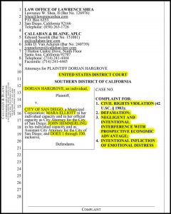 <p>Both Elliott and Gloria were in election campaigns at the time and both made comments that someone was using the “fabricated” footnote to sway the election. <br><br>Hargrove is now suing the City of San Diego, City Attorney Mara Elliott, and Deputy City Attorney John Hemmerling for civil rights violations, defamation, negligent and intentional interference with prospective economic advantage, and intentional infliction of emotional distress for having claimed that Hargrove fabricated the footnote without producing any evidence to prove the memo was not authentic. Elliott and Hemmerling were each named in both their official and personal capacities.</p>