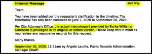 <p>“Per City Attorney’s Office, the actual memo/report provided by Burke Williams Sorenson is privileged in its original or edited version. Please keep this in mind as you review any responsive records for this request,” an internal staff message revealed in the CPRA request. Those internal comments are not usually released to the public.</p>