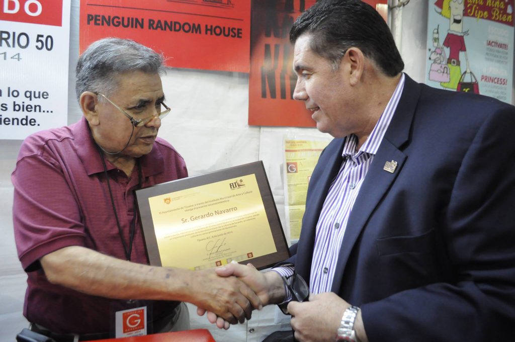 <p>Ahora bien, como preámbulo a la clausura de la XXXII Feria del Libro de Tijuana, el Director del Instituto Municipal de Arte y Cultura, Jesús Flores Campbell, acompañado de su equipo de trabajo y un grupo de entusiastas personas, caminaron por el recinto ferial hasta llegar al módulo de la “Librería de Gerardo”, sorprendiendo al Señor Gerardo Navarro, propietario de la librería, quien se encontraba en la caja del negocio para felicitarlo por 50 años de vida de su librería y hacerle entrega de un reconocimiento que dice: el Ayuntamiento de Tijuana, a través del Instituto Municipal de Arte y Cultura otorga el presente reconocimiento al Señor Gerardo Navarro, por su importante gestión y entrega al compartir con la comunidad su intensa relación con la palabra escrita. Valoramos su trayectoria de 50 años como librero en la ciudad de Tijuana, siendo un importante promotor de la literatura a través de la Librería de Gerardo, un referente cultural en varias generaciones de tijuanenses.</p>