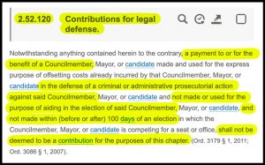 <p>All of the contributions received into the legal defense fund were for amounts that exceed the City’s $350 campaign contribution limits.</p>