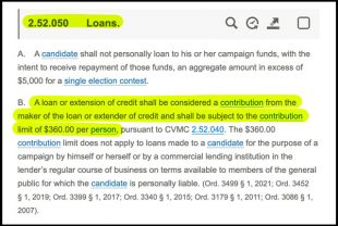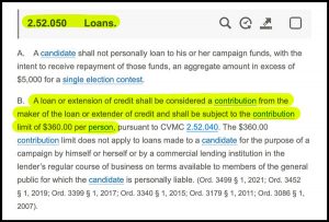 <p>The City’s Municipal Code defines “a loan or extension of credit” as a campaign contribution subject to the limit of $300 and only permissible from a person, not a company or entity. </p>