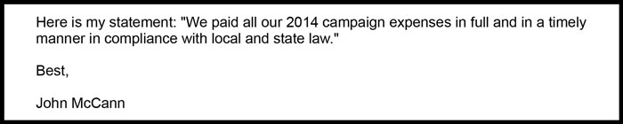 <p>“We paid all our 2014 campaign expenses in full and in a timely manner in compliance with local and state law,” is all McCann wrote.</p>
