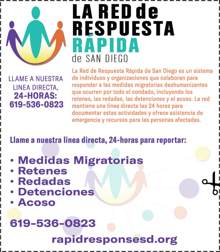<p>La Red de Respuesta Rápida de San Diego es un sistema de individuos y organizaciones que colaboran para responder a las medidas migratorias deshumanizantes que ocurren por todo el condado, incluyendo los retenes, las redadas, las detenciones y el acoso. Esta red mantiene una línea directa las 24 horas para documentar estas actividades y ofrece asistencia de emergencia y recursos para las personas afectadas.</p>