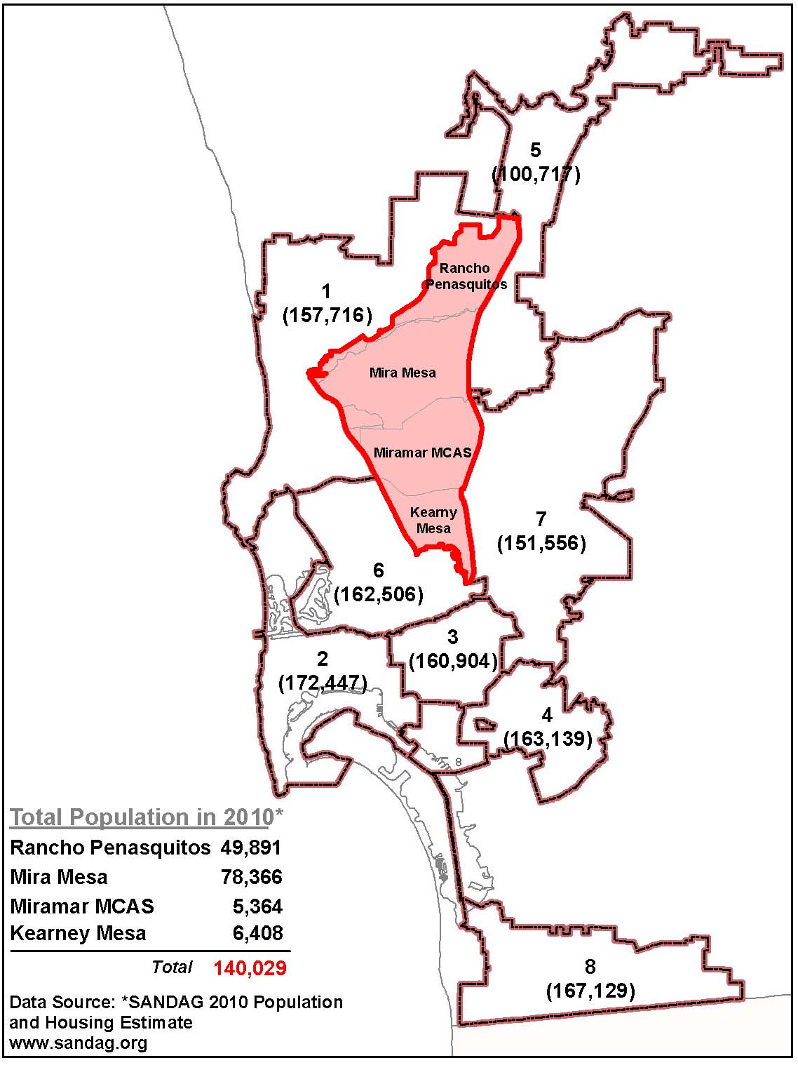 This time around the Asian American communities are looking at the Mira Mesa, Kearny Mesa, and Rancho Peñasquitos communities to create a block that would favor the election of Asian American to the council. Of the eight interested community members at the Nov 4 meeting, six were Asian Americans lobbying for a district that reflects their community.