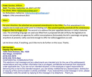 <p>The email Braun sought to “clawback” included within it a message from Deputy City Attorney Bill Gersten to Elliott describing proposed amendments to the CPRA to “hopefully preclude all the unnecessary litigation filed by Briggs, et al.”</p>
