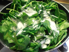 Keep stirring until the spinach is wilted (if necessary you can discard some of the liquid in the pan). Add the cream and the parsley. Add pepper and salt to taste.