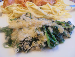 One thing you have to keep in mind. You can’t make this in advance. Never reheat the spinach once it’s cooked, boiled or steamed. But this recipe is easy to make so that won’t be problem. During the time it’s in the oven, you can prepare the rest of your meal. As I said, I served this as a side dish, the rest of the meal consisted of a creamy tagliatelle pasta with grilled salmon. A perfect combination!
