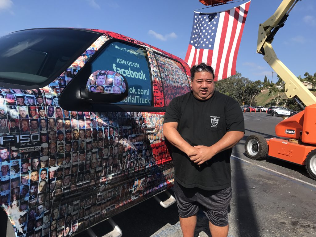 <p>Kaimoloa was at the event showcasing his truck known as, <a href="https://www.facebook.com/TheMemorialTruck/">The Memorial Truck</a>, which is wrapped with 4,422 pictures men and women who died in Iraq and Afghanistan. The pictures are colored in a way that from a distance it looks like a giant American flag but from up close they are photographs.</p>
